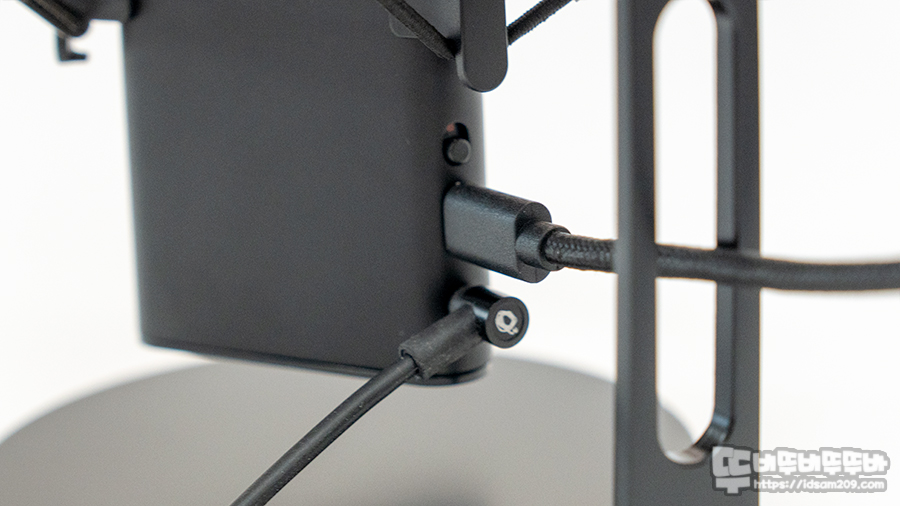 또한 LED 인디케이터는 상단의 RGB 라이팅과 연동되어 표현되며 마이크 뒷부분에는 AI 노이즈 캔슬링 버튼과 USB-C 연결 단자, 모니터링 이어폰 연결 단자로 심플하게 구성되어 있습니다.