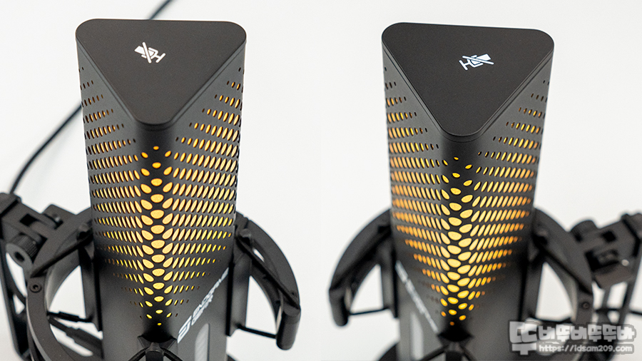 LED 효과와 음소거 LED 효과의 차이는 LED 효과는 마이크 상단에만 LED 표현되자만, 음소거는 상단과 하단 모두 LED 점멸로 표현되어 구분이 가능합니다.