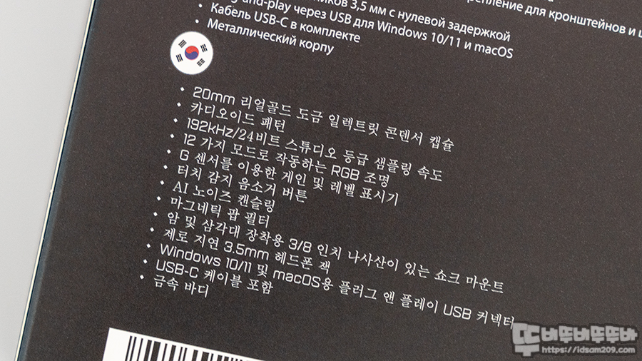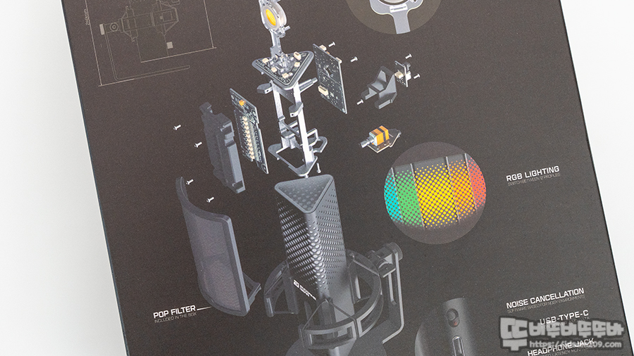 리얼 골드 도금 일렉트릭 콘덴서 / AI 노이즈 캔슬링 / GAIN LED 인디케이터 / 24비트 192kHz 샘플링 레이트 / 쇼크 마운트 / RGB 라이팅 등 제품의 특징으로 잘 표현하고 있습니다.