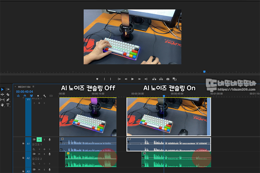 AI 노이즈 캔슬링 성능을 눈으로 확인하기 위해 프리미어 편집 화면을 캡처하였습니다.