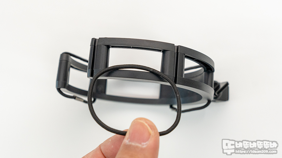 플라스틱 베이스의 쇼크 마운트는 3곳에 고무밴드를 이용하여 마이크를 고정하게 되는데 밴드가 고정되어 있지 않아 쇼크 마운트에서 마이크 분리 시 밴드 분실을 주의하시기 바랍니다.