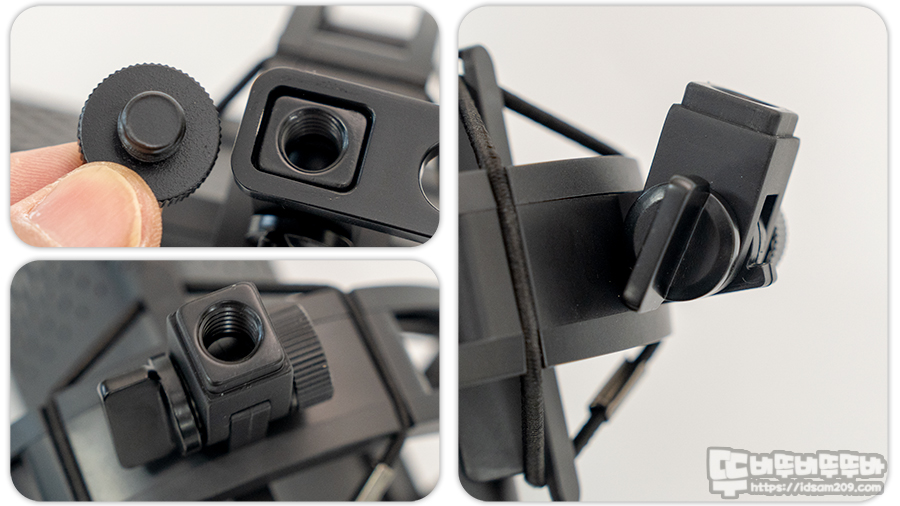 마이크에는 쇼크 마운트 밴드 고정용 가이드가 기본으로 부착되어 있어 쇼크 마운트가 없는 경우 거치대 또는 스탠드 연결이 어려운 독특한 구조지만, 거치대나 스탠드 사용 시 발생하는 진동 유입을 방지하기 위해서는 쇼크 마운트가 필수이기에 나름 괜찮은 아이디어가 적용된 거 같습니다.