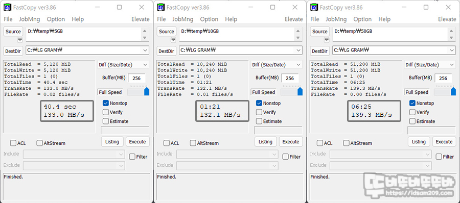5GB/10GB/50GB 더미 파일을 만들어 노트북에서 외장 HDD 간 데이터 복사로 쓰기 속도를 확인해 보면 용량에 따라 차이가 있긴 하지만 128.2 / 129.7 / 138.1 MB/s 속도를 보여주며 반대로 5GB/10GB/50GB 더미 파일을 만들어 외장 HDD에서 노트북으로 데이터 복사로 읽기 속도를 확인해 보면 133.0 / 132.1 / 139.3 MB/s 속도로 안정적인 속도를 확인할 수 있고요.