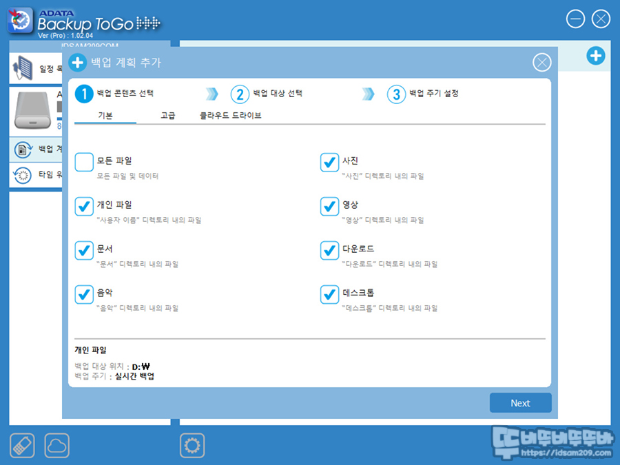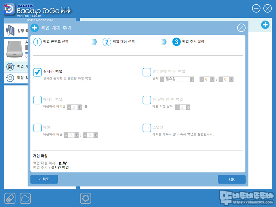 백업 방법 또한 실시간, 지정 시간, 지정 날자 및 시간 등 백업의 타이밍을 사용자의 사용 패턴에 맞게 설정할 수 있는데요.