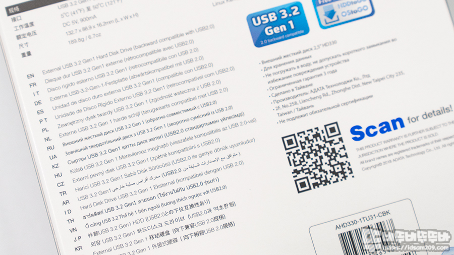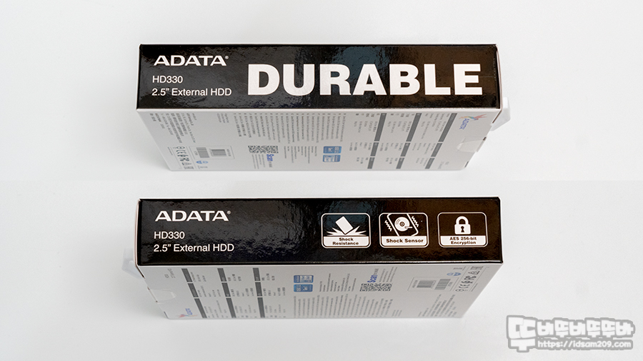ADATA 듀라블 외장하드 HD330 1TB 패키지에는 제품의 아이덴티티인 새 로고와 2.5" 외장 HDD 및 Durable 설명으로 외장 HDD를 튼튼하게 보호해 주는 느낌 그리고 제품의 용량인 1TB을 확인할 수 있습니다.