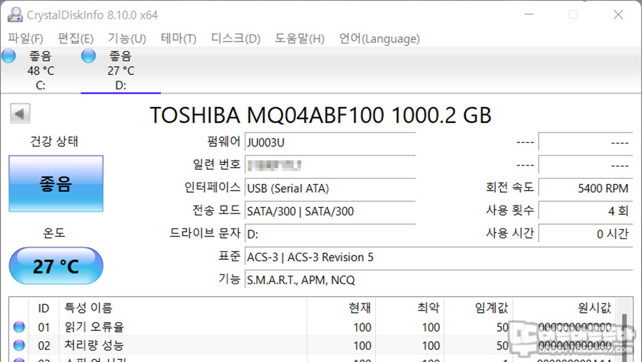 CrystalDiskInfo로 HDD 정보를 살펴보면 5400 rpm 속도의 도시바 1TB가 사용된 것을 확인할 수 있습니다.