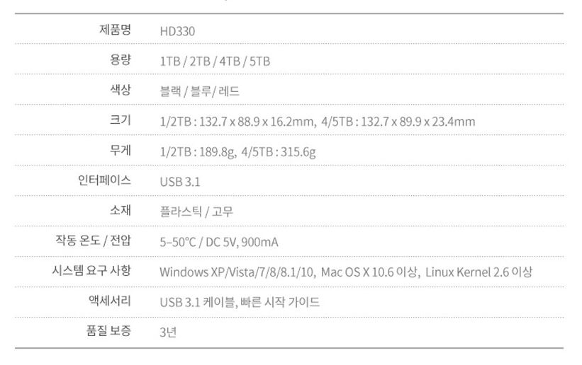HD330 제품군은 공식 스토어 판매가 기준 1TB (62,900원), 2TB (86,900원), 4TB (144,900원), 8TB (184,900원) 등 다양한 용량의 제품을 가성비 있는 가격에 판매되고 있으며 (주)마이넷비지니스에서 유통하는 정식 수입 제품의 경우 유료 ADATA Care+ (복구 서비스)를 지원하고 있습니다.