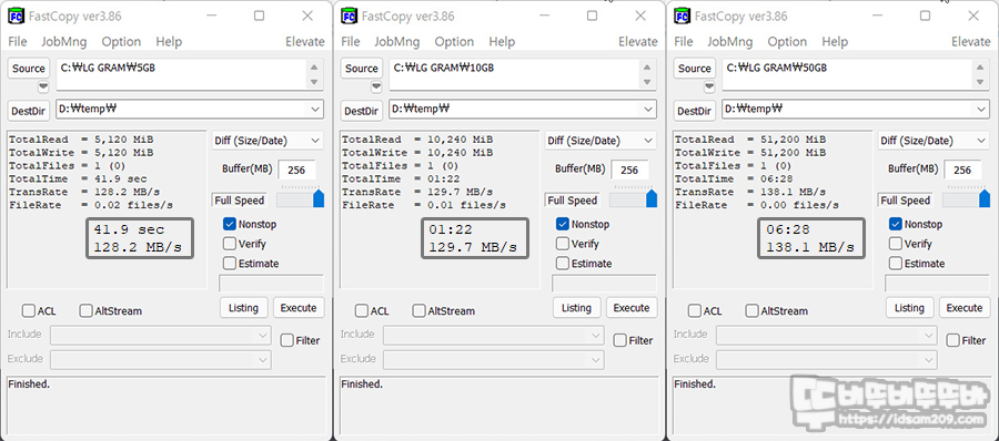 CrystalDiskMark 벤치에서도 보았듯이 확실히 쓰기 부분에서 용량이 적을수록 빠른 걸 확인할 수 있는데, 전용 프로그램을 이용한 백업 시 클라우드 서비스 못지않은 속도로 사용할 수 있을 거 같습니다.