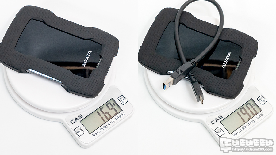 제품의 무게는 1g 단위로 측정 가능한 디지털 저울로 측정 시 외장 HDD 본체는 약 169g, 케이스를 포함하면 약 190g으로 부담 없이 휴대할 수 있는 무게를 보여주고 있습니다.
