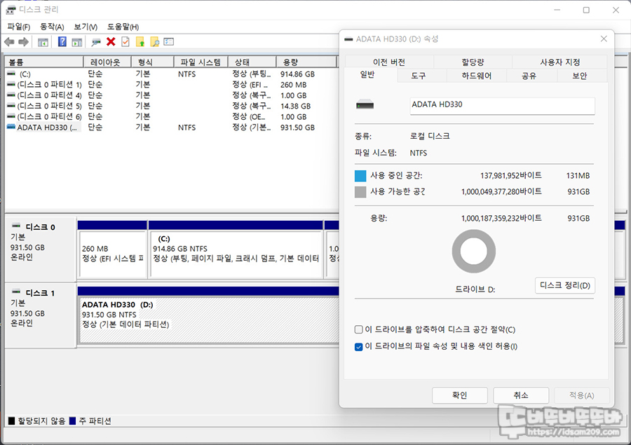 노트북에 연결하여 ADATA 듀라블 HD330 1TB 정보를 확인해 보니 기본 NTFS로 포맷이 되어 개봉과 동시에 바로 사용할 수 있네요.
