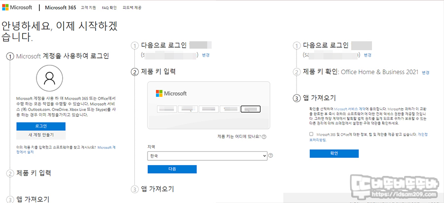패키지 개봉 시 인쇄된 https://setup.office.com 로 접속하여 설치를 진행해 줍니다.