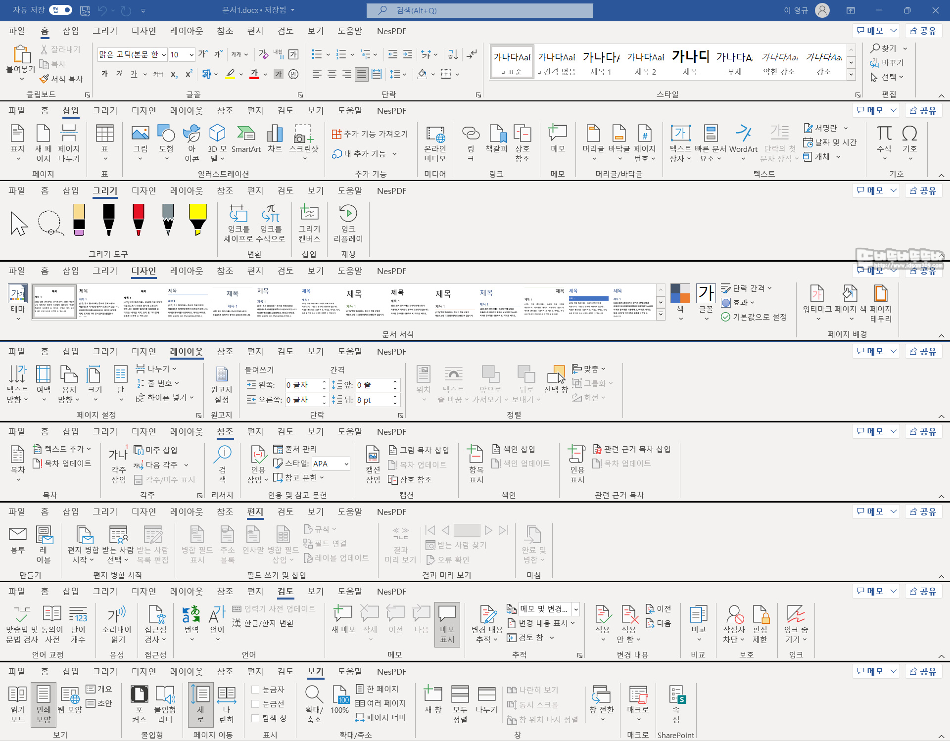 워드 메뉴 구성 모습.