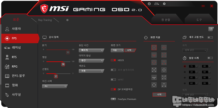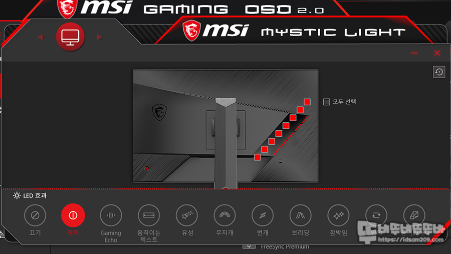 버튼으로 조작하는 메뉴에서는 게이밍 - Adaptive Sync On/Off 메뉴가 있지만, MSI GAMING OSD 2.0 소프트웨어에서는 FreeSync Premium으로 표현하고 있는데요.