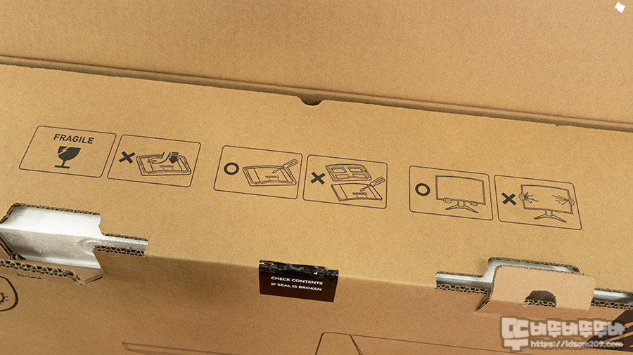 모니터를 앞뒤로 감싸고 있는 스티로폼 윗부분에 모니터 받침대 및 스탠드 연결 케이블 및 전원 아답터 등을 확인할 수 있으며 개인적으로 놀란 점은 모니터를 감싸고 있는 스티로폼이 개봉 중 분리되지 않게 고정하는 띠가 사용되어 안정적으로 모니터를 보호하고 있다는 점이었습니다.