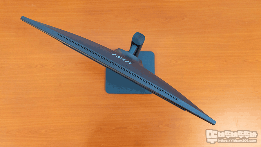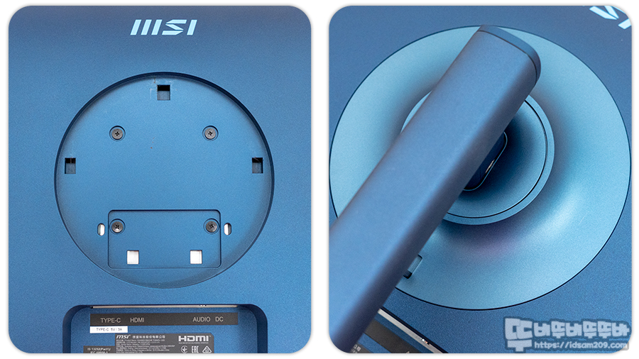 모니터 뒷면에 원형으로 보이는 중앙 스탠드 부분은 조금 밝은 톤의 블루 컬러가 사용되어 투톤 느낌을 주는데요.