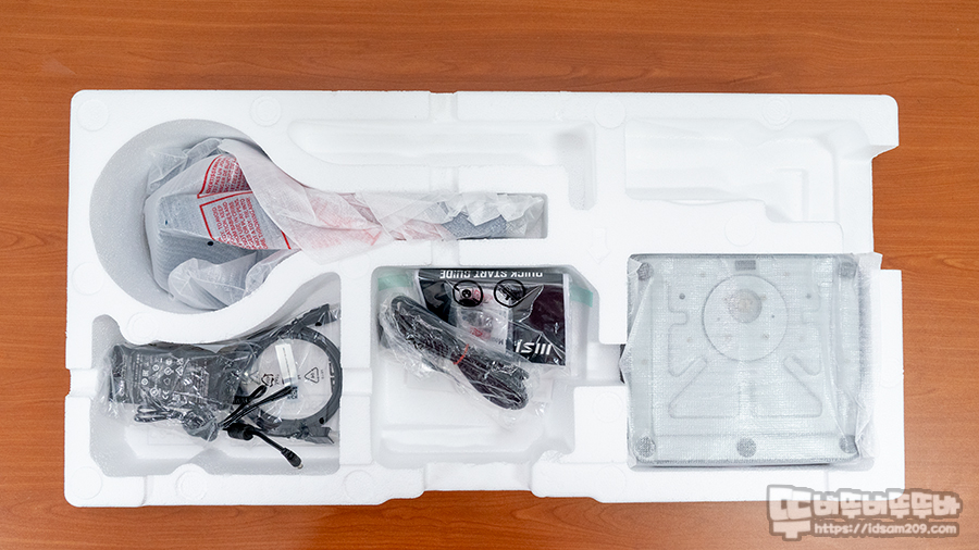 개별 포장을 벗겨 내용을 확인해 보면 받침대, 스탠드, 베사홀 아답터, 전원 아답터, HDMI 케이블, AC 코드, MSI관련 스티커 그리고 퀵 가이드 구성을 확인할 수 있습니다.