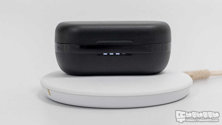 충전까지는 약 1.5시간 소요되며 완충 후에는 무선 이어버드 7시간 그리고 충전 케이스를 사용을 겸해 최대 21시간 사용이 가능합니다.