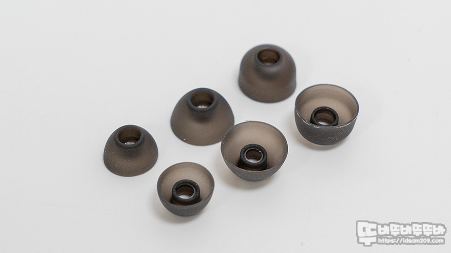 기본 장착된 실리콘 이어팁과 추가로 제공되는 이어팁을 비교해 보면 접시 모양의 이어팁 2종과 라운드형 이어팁으로 구분이 되니 귀의 밀착도를 위해 모두 사용해 보시고 가장 적합한 이어팁으로 사용하시기 바랍니다.
