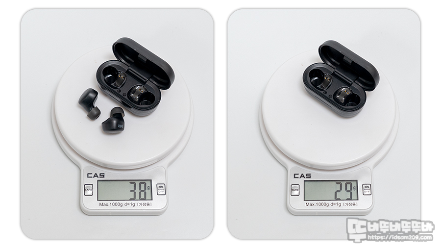 충전 케이스 무게는 약 29g, 충전 케이스 + 무선 이어버드 무게는 약 38g, 무선 이어버드는 약 4.5g x 2개 정도로 가벼운 편이지만 충전 케이스에 스트랩을 제공하지 않기에 분실을 주의하셔야 할 거 같네요.