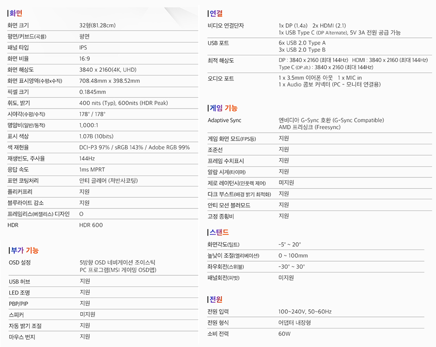 32인치 퀀텀 닷 IPS 패널에 3840 X 2160 4K 144Hz 지원, 픽셀 크기 0.1845mm, 화면 밝기 400니트, HDR 사용 시 600니트 지원, DCI-P3 97%, sRGB 143%, Adobe RGB 99% 안티 클레어, 어댑티브 싱크 지원, KVM 3대 지원 등 가격 대비 괜찮은 성능으로 무장하고 있네요.