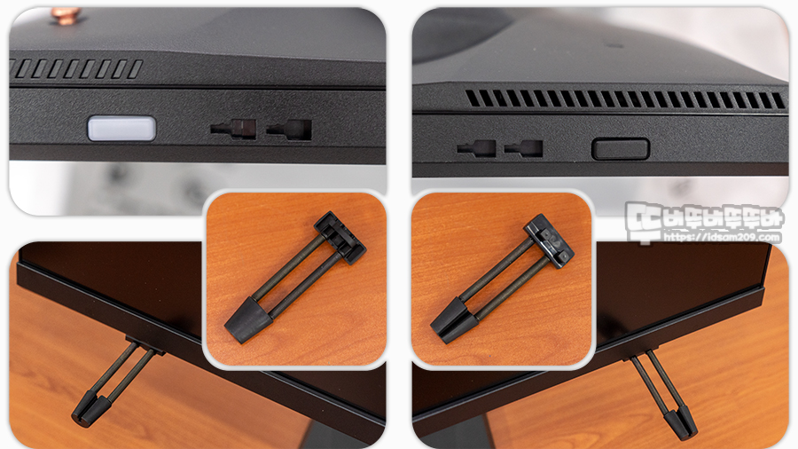 모니터 아랫부분에는 뒤쪽 기준 왼쪽에는 전원 스위치, 오른쪽에는 매크로 키로 구성되어 있으며 버튼 옆에는 마우스 사용 시 케이블을 고정할 수 있는 마우스 번지를 필요한 위치에 부착하여 사용할 수 있게 지원하고 있습니다.