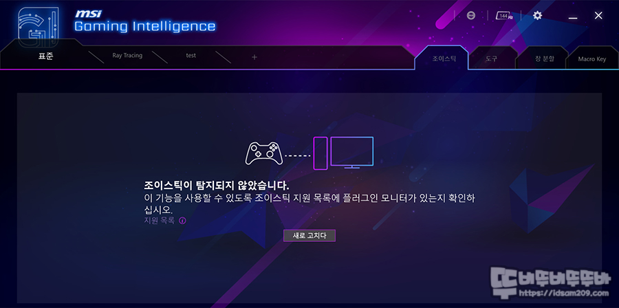 메뉴 오른쪽 상단의 조이스틱 연결이 되면 사용할 수 있는 조이스틱 메뉴, 도구, 창 분할, 매크로 기능 등 다양한 기능을 지원하고 있고요.