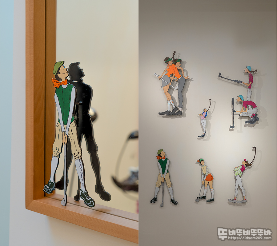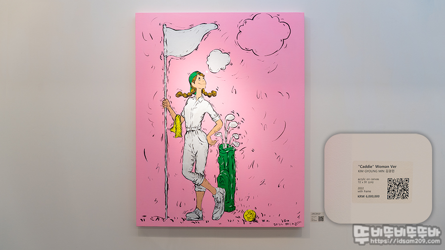 첫 번째 전시 공간에서 핑크 핑크한 작품에 그냥 눈이 가는데 특이하게도 남녀 골프 플레이어 이외 캐디 모습이어서 그런지도 모르겠습니다. 거기에 상남자의 핑크라서 ㅎㅎㅎ