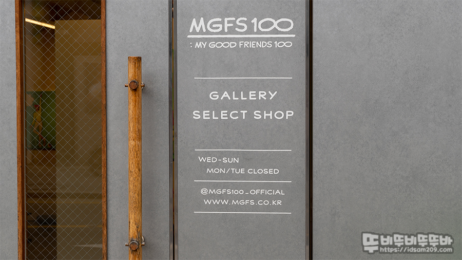 갤러리 입구에서 보이듯이 MGFS100은 MY GOOD FRIENDS 뜻임을 확인할 수 있고 중요한 건 아래 갤러리 / 셀렉트 샵이라는 표현으로 독특한 뭔가를 판매한다는 것을 알 수 있습니다.