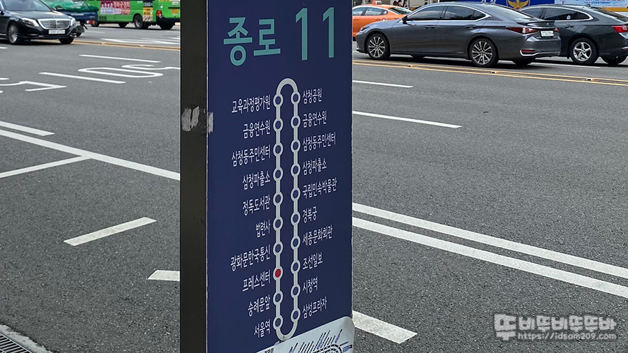 버스를 타는 위치는 시청역 4번 출구에서 조금 걷다 보면 서울 신문사 맞은편에 위의 사진과 같은 정류장 안내문을 확인하실 수 있는데 여기서 정차하는 종로 11 마을버스를 타고 금융연수원에서 하차하면 바로 왼쪽편에 MGFS100 갤러리를 찾을 수 있습니다.