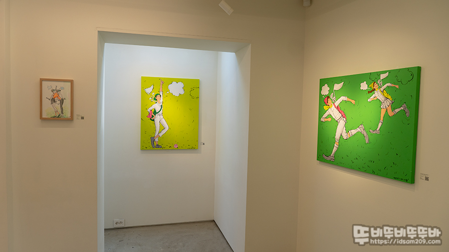 전시장 한쪽에 보이는 그린 컬러 배경과 보색 대비 느낌의 작품이 컬러 대조를 이루고 있어 강한 인상을 주더라고요.