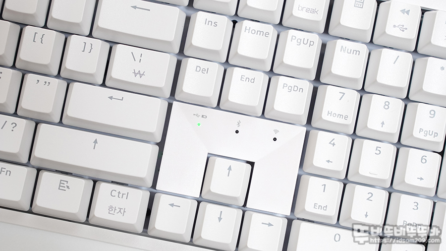 키패드 위에 위치한 Fn 조합으로 선택할 수 있는 유선 / 블루투스 무선 / RF 2.4GHz 무선 3가지 입력 방식은 각각의 입력 방식을 선택 시 Green / Blue / White LED 점등으로 현재의 연결 상태를 직관적으로 표현해 주며 블루투스 사용 시 Fn + 1 / 2 / 3 키를 선택으로 멀티 페어링으로 사용이 가능합니다.