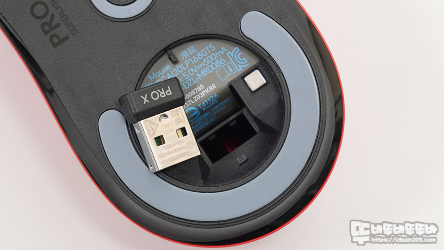 바닥면에 전원 On/Off 스위치와 넓은 면적으로 분포된 PTFE 피트를 확인할 수 있으며 마우스 후면의 파워 플레이 모듈 커버를 오픈하면 무선 리시버 수납 홀을 확인할 수 있는데 2.4 GHz 무선 리시버가 수납되는 부분은 자석이 아닌 플라스틱 홀에 꽉 끼듯이 고정되는 형태라 넣고 빼는 게 조금 불편할 수 있으니 참고하세요.