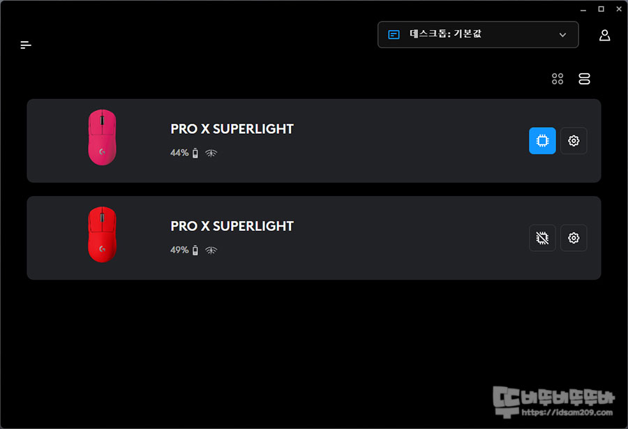 먼저 인트로 메뉴에서는 G-HUB에 연결된 로지텍 제품과 배터리 잔량을 %로 보여주기에 꽤 직관적임을 알 수 있고요.