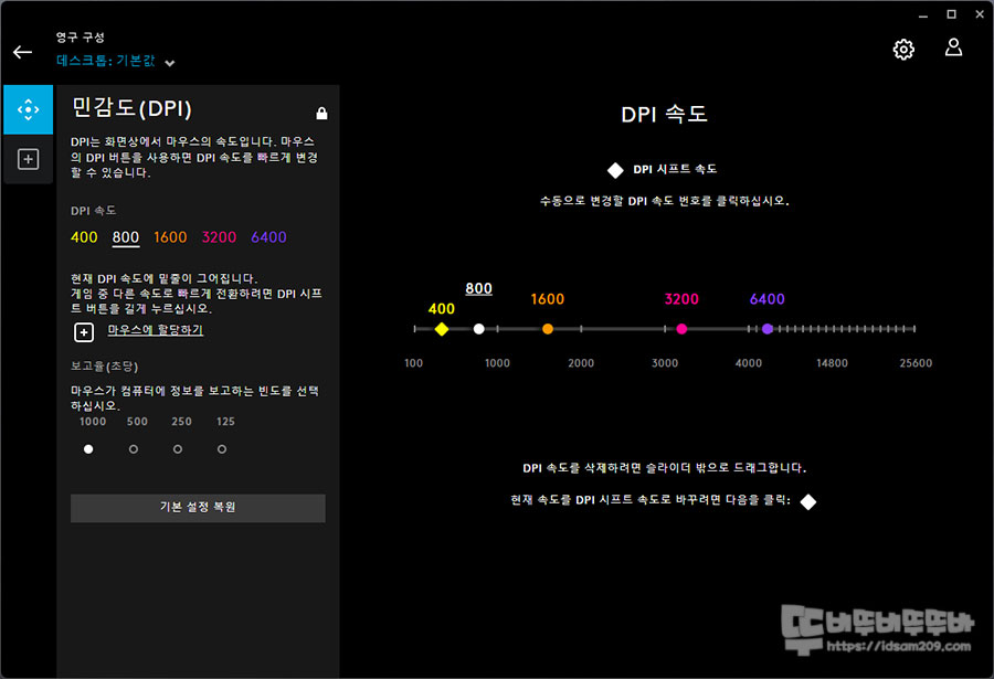 DPI 슬라이더 밖으로 컬러 도트를 드래그하여 놓으면 DPI 삭제, 슬라이더 중 원하는 곳을 마우스로 클릭 시 DPI 추가, 컬러 도트를 좌우로 드래그 시 DPI 변경 등 직관적으로 활용할 수 있는 게 강점입니다.