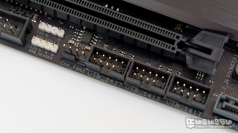 그 뒤로는 USB 2.0 헤더 2개 CHA_FAN 커넥터 +12V RGB 헤더와, +5V ARGB 헤더 그리고 전면 오디오 헤더 모습이 보이네요.