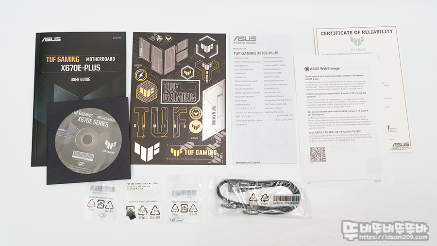 제품은 ASUS TUF Gaming X670E-PLUS STCOM 메인보드 이외에 사용 설명서, 드라이브 DVD, TUF 인증서 및 스티커, ASUS 워크 스토리지 안내서, SATA 케이블 2개, M.2 SSD 스탠드오프 및 고정나사, SSD용 스펀지로 구성되어 있습니다.