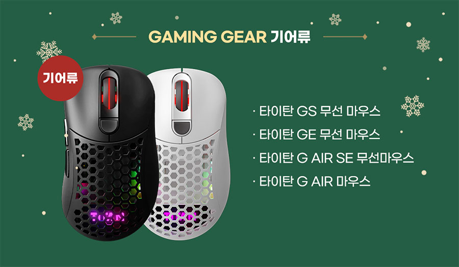 마우스 제품 중에서는 대중적인 디자인의 비대칭 GM Air 무선 마우스 또는 타이탄 G Air 무선 마우스를 추천드리며 그 이외에 제품도 괜찮으니 취향에 맞게 골라보시기 바랍니다.