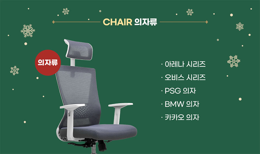 레이싱 체어 디자인이 적용된 아레나 시리즈, 파스텔톤 컬러가 이쁜 카카오 시리즈, 파리생제르망(PSG) 로고 또는 BMW 로고가 들어간 의자 그리고 최근에 출시된 오비스 사무용 메쉬 의자까지 초기보다는 훨씬 선택의 폭이 넓은 만큼 12월 21일 할인행사를 통해 원하시는 의자를 저렴하게 구입하실 수 있는 기회가 될 거 같네요.