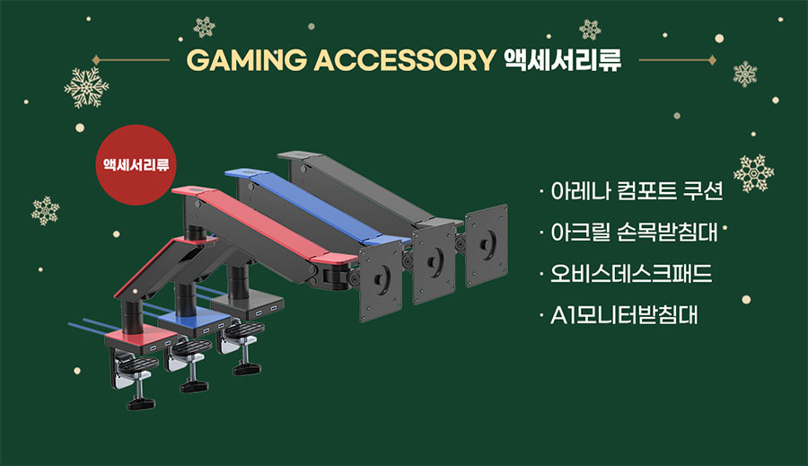 마지막 악세사리류의 경우 모니터 거치대, 모니터 받침대, 아크릴 팜레스트, 의자 허리 받침대를 판매할 예정이니 참고하시면 좋을 거 같네요.