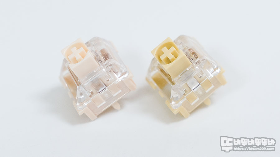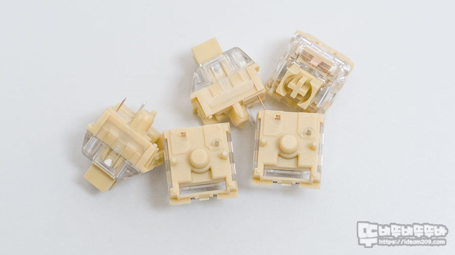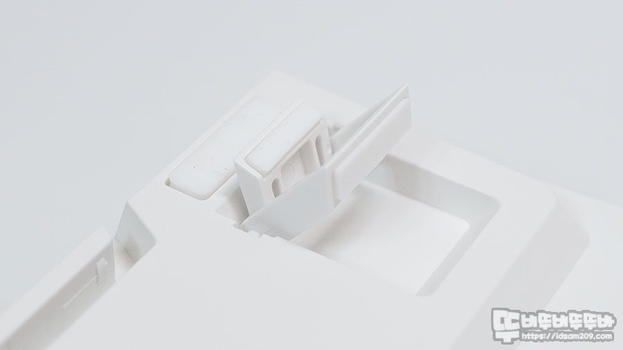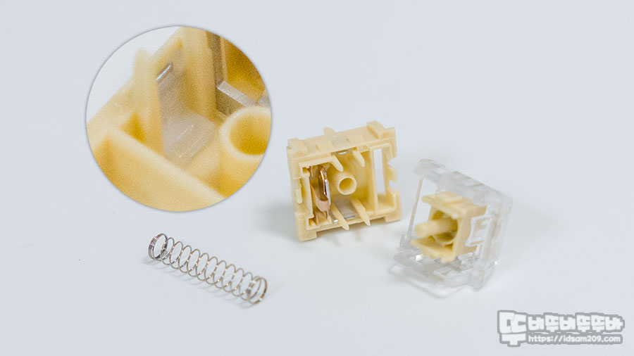기본적으로 먼지 유입을 방지해 주는 사격형 스템은 넌클릭 효과를 내는 약간의 돌기 그리고 스템에 실리콘 댐퍼가 부착된 체리 저소음 스위치와 다르게 스위치 하부에 실리콘 댐퍼가 부착된 걸 확인할 수 있습니다.