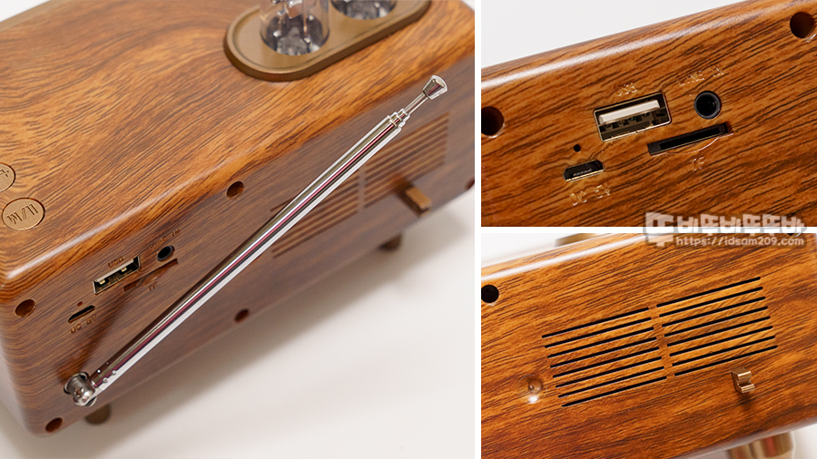 제품 뒷면에는 FM 라디오의 필수인 4단으로 전개되며 전체 길이는 약 345mm 접이식 텔레스코픽 안테나 그리고 USB-A/TF Card 메모리 입력단자, AUX in 외부입력 단자, Micro USB 전원 입력단자 모습을 확인할 수 있으며 그 옆에는 메인 스피커가 부착된 뒷면에는 패시브라디에이터가 내장된 홈도 눈에 띄네요.