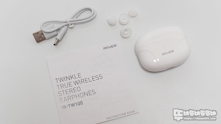제품은 IB-TW100 충전 케이스 + 이어버드, USB-C to A 충전 케이블, 여분의 실리콘 이어캡 소, 대 (중사이즈는 이어버드에 기본 장착), 사용 설명서로 구성되어 있습니다.