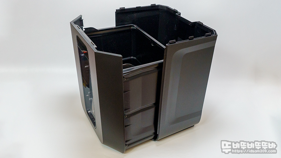 앞에서 잡아당기는 서랍 방식의 폐기함 서랍은 상단에 플라스틱 돌출구 조가 있어 쑥~하고 빠지지 않으니 천천히 잡아당겨 여시는 게 좋습니다.