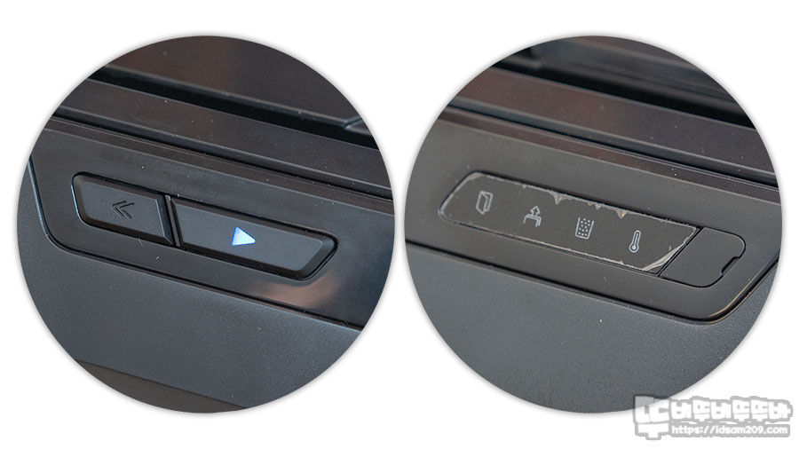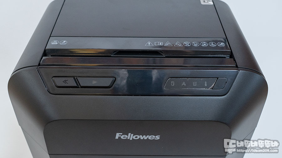 작동 버튼은 블루 LED 라이팅이 지원되며 폐지함이 열리거나 역회전으로 종이를 빼낼 때, 폐지통이 꽉 찼을 때, 과열이 되었을 때 해당 아이콘에 LED가 점등되어 상태를 쉽게 알 수 있네요.