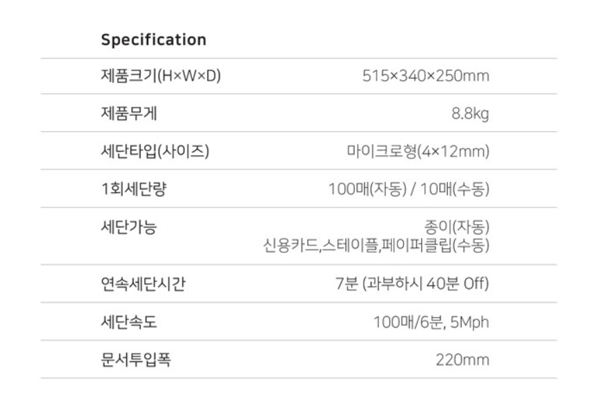 수동 및 연속 자동 급지를 통해 문서 파쇄가 가능하며 1회 파쇄 시 수동 급지를 통해서는 최대 10매, 자동 급지를 통해서는 최대 100매를 파쇄가 가능하다고 합니다. (용지 70g 기준)