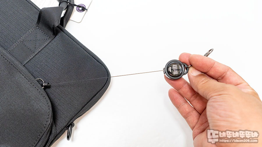 포켓에 기본으로 장착된 키 체인은 줄이 늘어나는 형태로 사용이 가능하기에 열쇠를 가방에 넣고 간편하게 사용할 수 있는 디자인이 적용된 게 특징입니다.