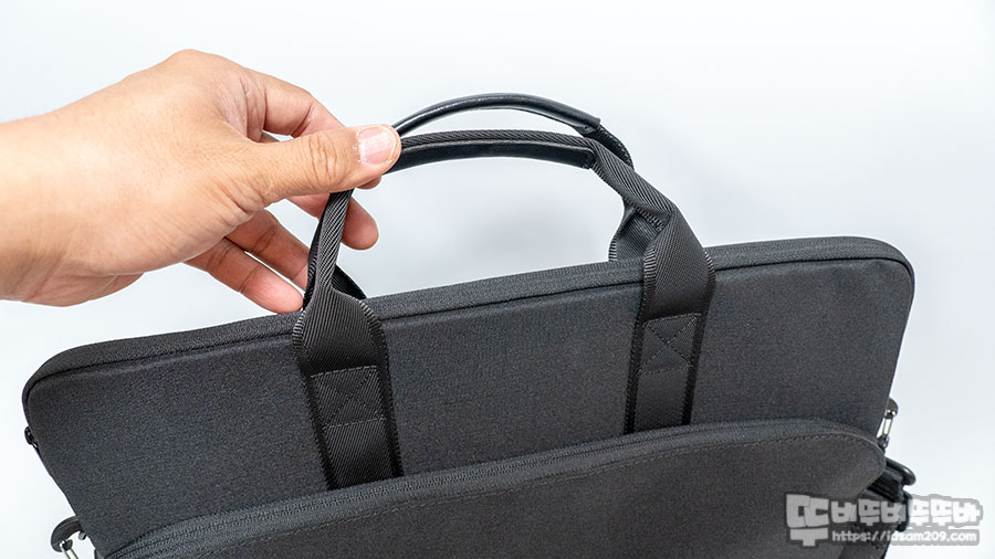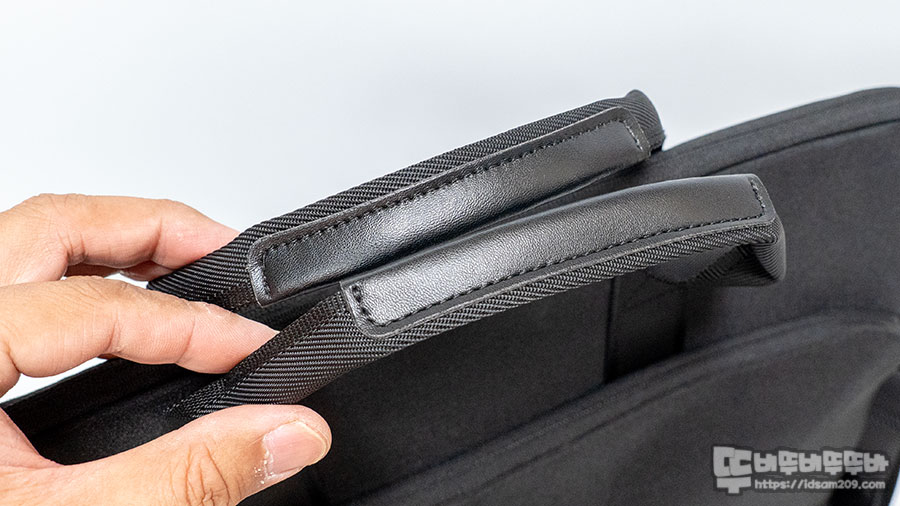 손잡이 안쪽 부분에 추가된 비닐 가죽이 조금 독특했는데 가방을 사용 시 손잡이가 위/아래로 겹치면서 비닐 가죽 부분이 바깥쪽으로 향하여 그립을 지지하는 형태가 되어 괜찮은 그립감을 제공하네요.
