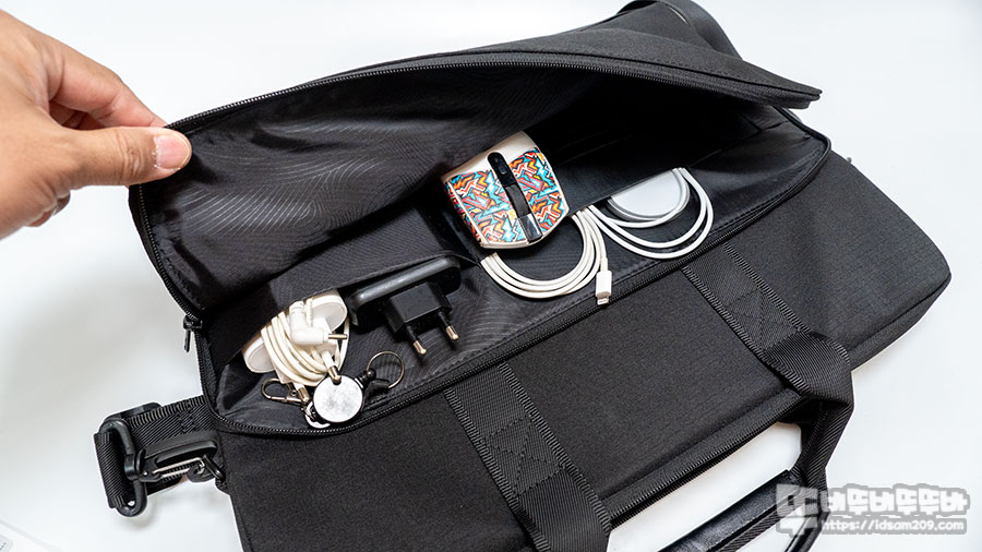 평소에 휴대하고 다니는 2020 그램 14 노트북과 무선 마우스, 충전기, 휴대폰 충전기, 아이폰 맥세이프 충전기 및 8핀 to USB-C 케이블 구성을 가방에 수납해 보았습니다.