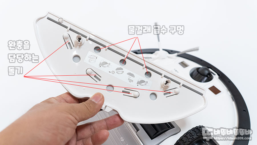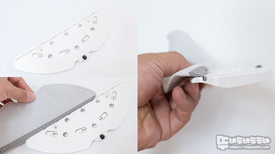 별도로 부착하는 물걸레 판은 3개의 급수 구멍 양쪽에 고정 핀을 물탱크에 고정하여 사용하게 되며 완충을 담당하는 돌기가 물걸레가 바닥에 밀착할 수 있게 도와줍니다.