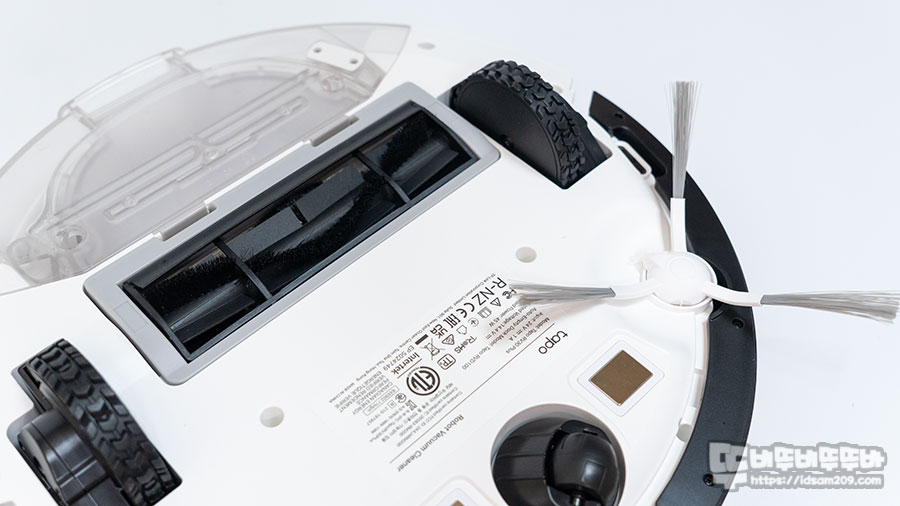 제품 오른쪽에 회전하는 사이드 브러시는 바닥면에 밀착이 되게 휘어진 디자인이 적용되어 밖에서 안쪽으로 회전하며 먼지를 모으면 중앙의 실리콘 날개와 웨이브 형태 조합의 메인 브러시가 작동하면서 먼지를 흡입하는 방식으로 청소를 완성하는 구조로 되어있습니다.